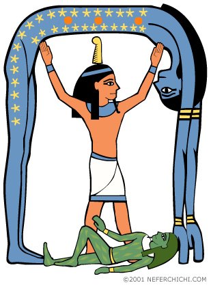 Deusa Nut(deusa do luar, da noite) sendo erguida pelos braços do deus do ar seco (deus Chu) e deus Geb sendo pisoteado por deus Chu, para separá-los